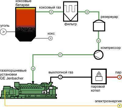 Рис. № 2. Схема утилизации коксового газа на заводе Profusa, Испания (состав газа: H2 - 55% CH4 - 30% CO - 5% CO2 - 5% N2 - 5%).