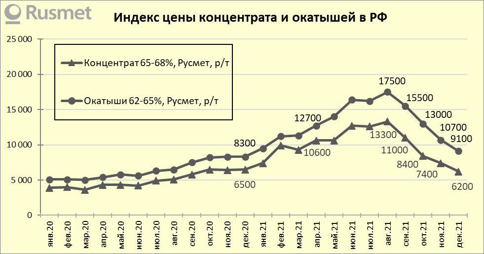 Согласно данным РА Русмет, в декабре цена на концентрат и окатыши будет продолжать свое снижение после достижения максимума в августе. Индекс цены на концентрат с содержанием железа 65-68% на декабрь составит 6 200 р/т, снизившись относительно августа более чем в два раза. Относительно ноября индекс снизился на 17%. По сравнению с декабрем прошлого года цена на концентрат упала на 5%.