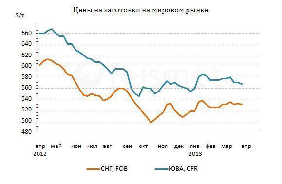 Во второй половине марта были вынуждены отказаться от намеченного ранее повышения корейские компании. Если в начале прошлого месяца они пытались довести стоимость заготовок до более $570 за т FOB, то в конце его они заключали сделки из расчета $570-575 за т CFR – наравне с японскими поставщиками. Продукция из СНГ еще в начале третьей декады марта могла продаваться в Индонезию по $575 за т CFR, но ближе к началу апреля экспортеры вынужденно сбросили цены до $560-565 за т CFR. А встречные предложения в их адрес приходят уже на уровне $550 за т CFR, что практически закрывает возможность поставок полуфабрикатов из черноморских портов (по крайней мере, при нынешних котировках на Ближнем Востоке).