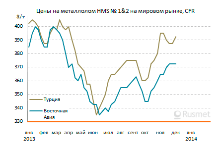 Наиболее высокие в регионе темпы роста котировок на сырье демонстрирует Япония, где спрос на конструкционную сталь как раз очень высок, а объемы производства стали достигли максимального с 2008 года уровня. Компания Tokyo Steel Manufacturing, крупнейший покупатель лома в стране, в течение ноября пять раз повышала закупочные цены, хотя и не для всех своих заводов одновременно, а 3 декабря снова подняла их на $5 за т.