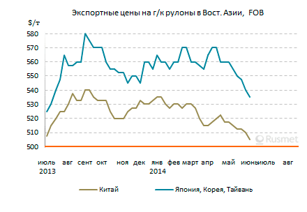 Коммерческая стальная продукция из стран Северо-Восточной Азии присутствует на региональном рынке в сравнительно небольших объемах и по низким ценам. По данным трейдеров, экспортеры выставляют цены на горячий прокат на уровне $540-560 за т FOB, но реальные сделки осуществляются в интервале $520-550 за т FOB. Прогноз на июль негативный.