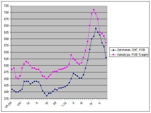 В целом ожидания большинства участников рынка трудно назвать благоприятными. Рынок пуст до такой степени, что некоторые трейдеры сравнивают нынешнюю ситуацию с августом 2008 года. Основные надежды возлагаются на то, что ближневосточные торговые компании в ближайшем будущем все-таки возобновят импорт арматуры, чтобы пополнить свои запасы для июльских продаж. Кроме того, котировки на внутренних рынках ближневосточных стран снижаются гораздо медленнее, чем экспортные. Так, в ОАЭ стоимость арматуры составляла в середине мая $680-705 за т с доставкой.