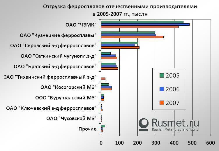 /© Rusmet.ru, Марк Сергеев/ В прошедшем году на российском рынке ферросплавов наблюдалась положительная динамика развития основных показателей. По сравнению с 2006 годом заметно выросли объемы производства и потребления. Наибольшие объемы отгрузки среди производителей отмечались у ОАО «ЧЭМК» и ОАО «Кузнецкие ферросплавы», в то же время большая часть других крупных производителей продемонстрировали положительную динамику производства.