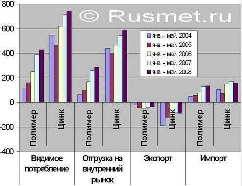 Что касается динамики внешнеэкономической деятельности по этим товарным группам, отметим, что экспорт оцинковки в январе-мае 2008 г. относительно аналогичного периода 2004 г. упал более чем вдвое, а экспорт «полимерки» подскочил более чем вдвое в 2005 г. и с тех пор лишь немного снизился. Объем импорта листа с полимерным покрытием рос заметнее и составляет большую долю в видимом потреблении, чем объем импорта оцинкованного листа.
