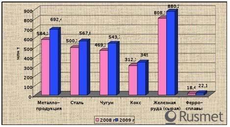 По данным CMW, в 2009 г. в стране было произведено 567,84 млн т стали, что на 67,53 млн т (или на 13,5 %) превысило уровень 2008 г. Производство готовой металлопродукции в 2009 г. составило 692,44 млн т (включая незначительный двойной счет) (рост на 108,1 млн т или на 18,5 %).Производство чугуна в прошедшем году увеличилось на 15,9 % по сравнению с 2008 г. и составило 543,75 млн т. Темп прироста чугуна в 2009 г. был на 2,4 процентных пункта выше, чем прирост стали.