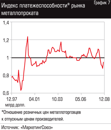 Если этот показатель падает ниже единицы, то это означает, что торговцы в целом готовы продавать металл в убыток ради сохранения оборотных средств. По сути дела, этот индекс показывает степень оптимизма профессиональных металлоторговцев в отношении развития спроса на прокат. Несмотря на то что индекс платежеспособности сейчас ниже единицы, он все еще остается много выше уровня 1997–1998 годов, самых черных годов для рынка черных металлов. Более того, последние данные на середину ноября показывают рост этого показателя. Так что, судя по всему, торговцы ожидают улучшения ситуация и со спросом, и с ликвидностью.