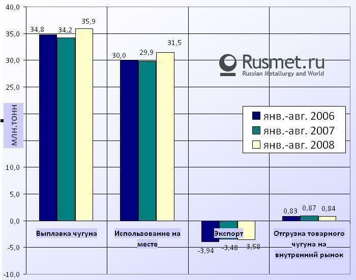 Объемы внутреннего производства чугуна в России по итогам 8 месяцев 2008 года составили 35,9 млн.тонн, что выше результатов аналогичного периода прошлого года почти на 5%. Из этих объемов почти 31,5 млн.тонн пришлось на потребление «на месте» (+5,4% к уровню аналогичного периода прошлого года). Экспорт, при всей своей нестабильности на протяжении последних месяцев, к началу осени едва превысил 3,5 млн.тонн, что лишь едва больше (+3%), чем за аналогичный период прошлого года.