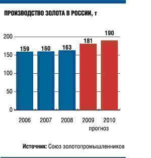 В 2009 году добыча золота в России составит 181,8 т, посчитали в Союзе золотопромышленников. Это на 10% больше, чем годом ранее. Но уже с 2010 года выпуск желтого металла начнет замедляться. Причиной замедления станет эффект «высокой базы» текущего года.