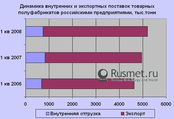 За первый квартал текущего года российскими предприятиями было отгружено свыше 5,2 млн.тонн товарных стальных полуфабрикатов, причем свыше 85% от этого объема ушло на экспорт. Таким образом, внешнеторговые поставки по сравнению с первым кварталом прошлого года выросли на 8%, в то время как поставки внутренним потребителям на 11% сократились.