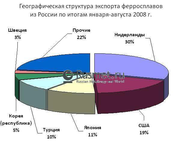 Основными странами потребителями российских ферросплавов стали Нидерланды, США, Япония, Турция и Корея – суммарные объемы отгрузок в эти страны составили ¾ от всего российского экспорта.