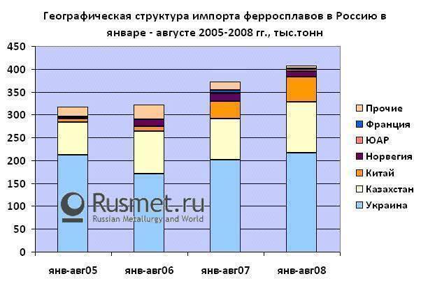 В результате мы имеем сейчас следующие показатели. За 8 месяцев внутренний спрос на ферросплавное сырье составил немногим более 0,75 млн.тонн, превысив показатели прошлого года на 3% (причем надо отметить, что данный результат – высший за последнюю пятилетку). При этом, рост объемов ввоза ферросплавов из-за рубежа составил свыше 9%. Доля импортной продукции на внутреннем рынке увеличилась до 54% (по сравнению с показателями порядка 47% в 2006-2007 гг.).