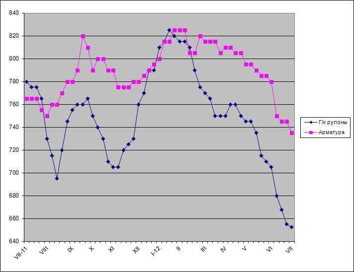 Спад затронул все сегменты американского рынка стали. Арматура в начале июля также подешевела до самой низкой отметки более чем за полтора года и находится в интервале $730-740 за метрическую т (EXW). Примерно такими же являются и рыночные цены на низкоуглеродистую катанку, достигающие, максимум, $750 за т EXW. Толстолистовая сталь за последние полгода упала в цене почти на $200 за т. Котировки на материал А36 в настоящее время не превышают $940-970 за т EXW.