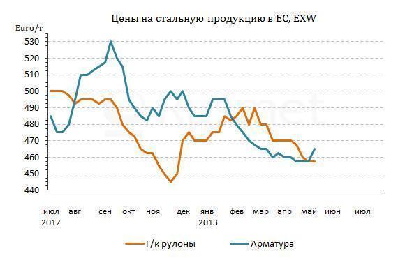 на арматуру, достигшие к началу второй декады мая отметки 450-460 евро за т EXW против 435-450 евро за т в апреле, могут вскоре