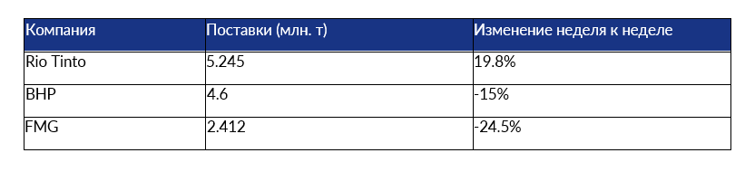 Из трех ведущих австралийских горнодобывающих компаний, две – BHP и Fortescue Metals Group – сократили свои поставки в Китай после увеличения объемов на предыдущей неделе: у первой объем снизился на 810 тыс. т или на 15% за неделю до 4,6 млн. т, а у второй – на 784 тыс. т или на 24,5% за неделю до 2,4 млн. т.