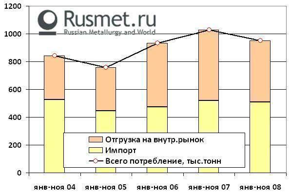 Еще одной характеристикой внутреннего ферросплавного рынка стала рекордно высокая доля импортной продукции. Порядка 54% всех потребленных российскими предприятиями ферросплавов были произведены за рубежом (в то время как в 2006-2007 гг. распределение отечественной и импортной продукции составляло примерно 50/50).