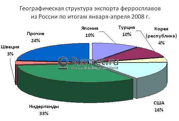Среди крупнейших потребителей российских ферросплавов в мире остались Нидерланды (треть от общего экспорта из РФ, +5% к уровню отгрузки за аналогичный период прошлого года), Япония, Турция. Кроме того, значительно повысилась отгрузка ферросплавной продукции в США. Американский рынок по итогам рассматриваемого временного отрезка получил на 55-60% больше российских ферросплавов, чем за аналогичный период прошлого года.