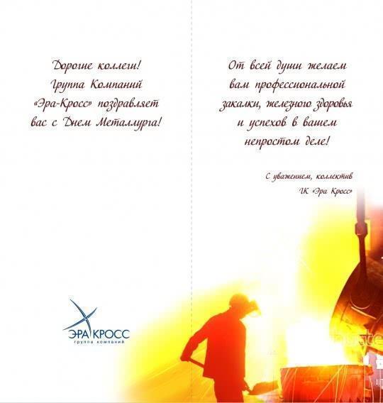 Группа Компаний «Эра-Кросс» поздравляет вас с профессиональным праздником , и желает вам оставаться всегда преданными сложной и нужной профессии металлурга!