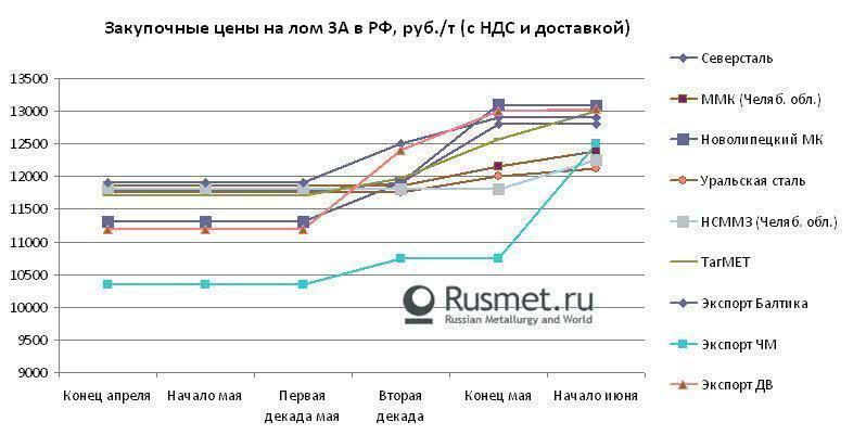 По данным ежемесячного аналитического обзора «Rusmet-Прогноз.Лом», уже в середине мая закупочные цены экспортеров Балтики и Дальнего Востока находились на уровне 13 тыс.руб./т лома (3А с доставкой). Естественно, что порядок цифр закупочных цен металлургов не мог позволить им выдерживать конкуренцию за потоки ресурса. В результате, к концу месяца произошел ряд ценовых повышений.