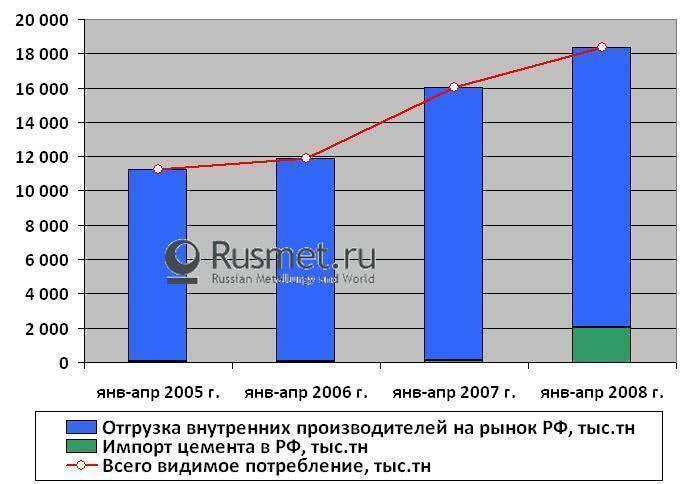 Несмотря на то, что российские производители цемента постепенно продолжают сокращать отставание от уровня прошлого года в объемах отгрузки, их доля на внутреннем рынке неуклонно сокращается. Разница в спросе и внутреннем предложении вылилась в то, что объемы импорта с начала года составили порядка 2 млн.т и уже почти сравнялись с результатами ввоза продукции из-за рубежа за весь прошлый год. Если сопоставлять итоги текущего периода и данные января-апреля 2007 года, то можно констатировать рост поставок цемента в РФ в 21 раз!