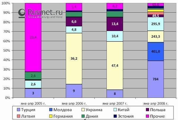 Среди основных стран-поставщиков цемента в РФ в 2008 году выступает Турция, доля которой в суммарных поставках достигла практически 40%. Еще порядка 20% от суммарного импорта было отгружено из Молдовы. Всего лишь на третьем месте оказались поставки цемента из Китая – несмотря на виртуальную выгодность поставок, процесс не идет полным ходом в силу логистических проблем. Кроме этих трех стран, можно отметить также Украину, отгрузившую за январь-апрель около 0,25 млн.т цемента. Не столь значительные объемы цемента были направлены в Россию из Европы (Польша, Германия, Дания и пр.).