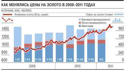 В конце прошлой недели World Gold Council (WGC) опубликовал исследование по мировому производству и потреблению золота в первом квартале 2011 года. Согласно опубликованным данным, спрос на золото вырос по сравнению с аналогичным периодом предыдущего года на 11%, до 981,3 тонны. По сравнению с предшествующим кварталом спрос незначительно снизился, в пределах 3%. Основными потребителями золота остаются ювелирная отрасль и промышленность, на которые пришлось 68% всего мирового спроса (670,7 тонны). Это на 7% выше показателя первого квартала 2010 года. Более динамично рос инвестиционный спрос — по сравнению с предшествующим годом он вырос на 26% (до 310,5 тонны). За отчетный период цены на золото выросли слабо — менее чем на 1%, до $1430 за унцию. Однако в последующие неполные два месяца котировки поднялись выше $1500 за унцию, в настоящее время цена составляет $1530 за унцию (на 5,8% выше значения окончания конца первого квартала).