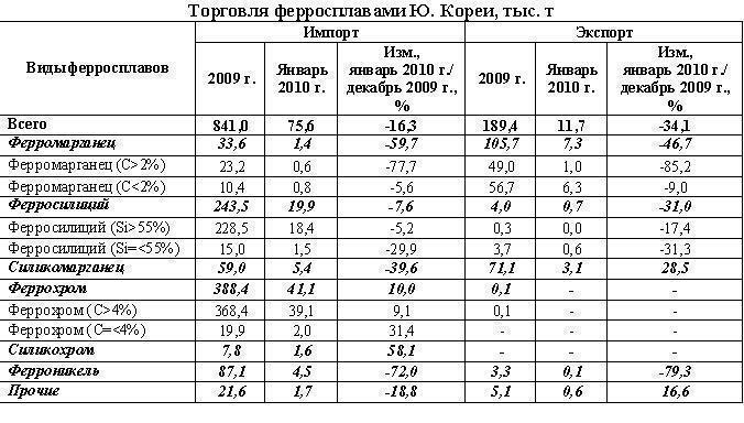 /Rusmet.ru/ В прошедшем 2009 г. Ю.Корея на фоне сокращения производства черных металлов снизила закупки за рубежом ферросплавов по сравнению с 2008 г. Импорт ферросплавов в Ю.Корею в 2009 г., по данным Tex Report, составил 841 тыс. т, что почти на 13,3% ниже показателей предыдущего года (970 тыс.т).В январе 2010 г. в Ю.Корее вновь было отмечено снижение закупок ферросплавов на мировом рынке. Импорт ферросплавов в январе текущего года составил 75,6 тыс. т, что на 16,3 % ниже, чем в декабре 2009 г. Отметим, что Ю.Корея в январе увеличила закупки сплавов хрома и сократила ввоз других сплавов, в том числе марганцевых сплавов. Импорт феррохрома в Ю.Корею вырос в январе на 10 %, а силикохрома – на 58,1%. Существенно сократился ввоз ферроникеля - на 72 %, что было связано с высоким объемом закупки в декабре (251 т).Экспорт ферросплавов из Ю.Кореи в 2009 г. значительно уступает импорту. В 2009 г. экспорт ферросплавов из страны составил 189 тыс. т. Основной статьей экспорта являются марганцевые сплавы – ферромарганец и силикомарганец.В январе 2010 г. поставки ферросплавов из Ю.Кореи на экспорт снизились по сравнению с предыдущим месяцем. При этом страна увеличила экспорт силикомарганца и сократила поставки на мировой рынок прочих сплавов.