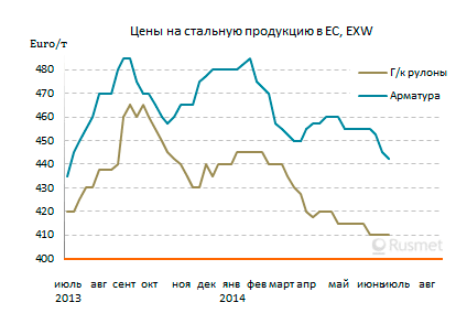 /Rusmet.ru, Виктор Тарнавский/ Спад на европейском рынке стали, продолжающийся фактически с января текущего года, никак не удается остановить. С начала июня стоимость длинномерного проката в регионе уменьшилась на 10-15 евро за т. В частности, арматура в настоящее время, в основном, варьируется между 425 и 460 евро за т EXW. Котировки на плоский прокат в текущем месяце примерно на 5 евро за т уступают майским показателям, а некоторые компании, ранее предлагавшие свою продукцию по ценам выше рыночных, опускают их до уровня конкурентов.