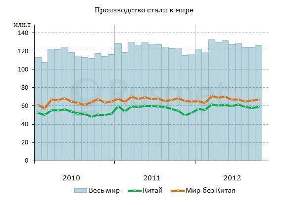 Всего за десять месяцев 2012 года в Китае было произведено 593,7 млн. т стали, на 2,0% больше, чем годом ранее. Очевидно, что годовой результат превысит 710 млн. т. Правда, по данным национальной металлургической ассоциации CISA, совокупные мощности отрасли к концу года приблизятся к отметке 1 млрд. т в год.