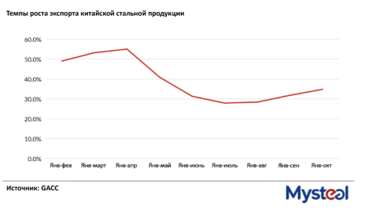 По данным Mysteel Global, темпы роста объемов экспорта за первые десять месяцев ознаменовали третий подряд подъем после 27,9% роста, зафиксированного за первые семь месяцев текущего года.