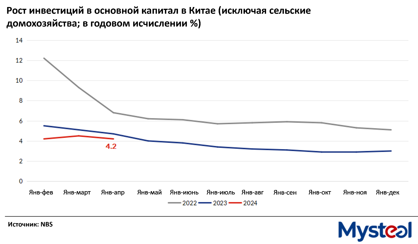 Китайский показатель индекса инвестиций в основной капитал за январь-апрель вырос на 4,2%, недвижимость упала на 9,8% по сравнению с аналогичным периодом прошлого года
