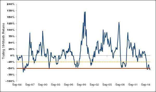 Давайте внимательно рассмотрим ретроспективу цен на нефть. Выручка от продажи сырой нефти марки WTI (West Texas Intermediate, известна также как Texas light sweet, аналогична по составу марке Brent) находится в настоящее время вблизи исторических минимумов, как показано на Диаграмме Б ниже. Минимумы выручки исторически составляют приблизительно -50%. Мы уже видели эти уровни в этом году совсем недавно: в сентябре, октябре и ноябре.