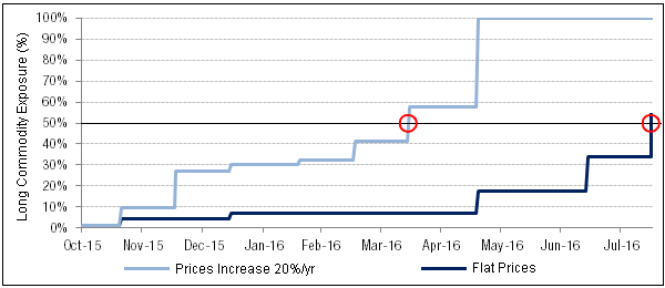 «Плоский» сценарий выставляет эти 50% до августа 2016. Если Вы - оптимистичный инвестор, мы полагаем, что самое время вложиться в коммодитиз - в 1 квартале 2016 года, задолго до «последнего звонка» в августе, если цены останутся на нынешних уровнях.
