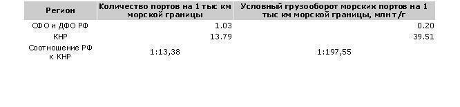 Таблица N1. Сравнительный анализ плотности морских портов и их условного грузооборота на 1 тыс. км морской границы СФО-ДФО РФ и КНР в 2007 г: