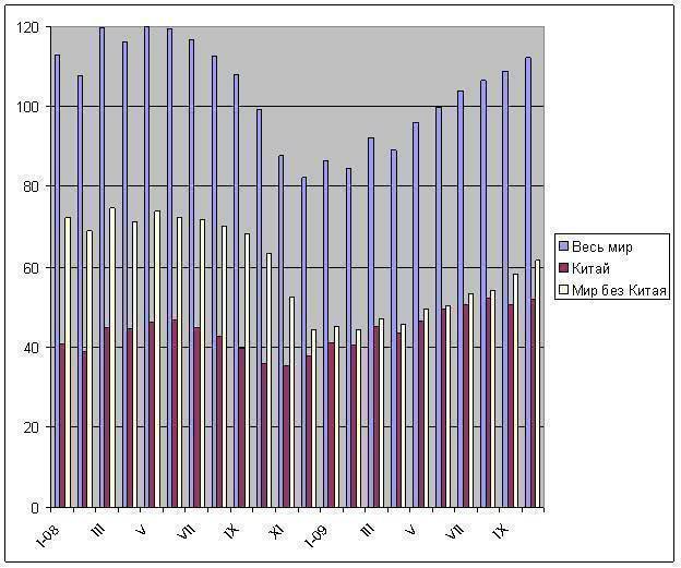 Конечно, огромное влияние на общие показатели оказывает Китай, где в октябре 2009 года было выплавлено 51,7 млн. т стали – на 42,4% (!) или на 15,8 млн. т больше, чем за тот же период 2008 года. Для "остального мира" результат октября 2009-го все еще остается отрицательным: 61,5 млн. т против 63,4 млн. т в октябре 2008-го. Тем не менее, если брать за точку отсчета не прошлую осень, когда на производство стали в Китае оказали влияние не только экономический кризис, но и Олимпиада, а первый квартал текущего года, мы увидим, что восстановление металлургической отрасли в странах "остального мира" идет более высокими темпами, нежели китайский подъем. Так, если в апреле 2009 года на долю Китая пришлось 48,8% от мирового объема выплавки стали, то в октябре – 46,1%.