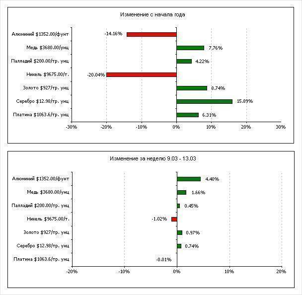 По итогам прошедшей недели металлы в основном выросли, исключением стал никель. В целом, неделя для металлов закончилась на позитиве, хотя кроме алюминия выделить особенно нечего. И это несмотря на то, что в целом в мире наблюдался подъем: росли фондовый и нефтяной рынки. Металлы пока продолжают оставаться в стороне от общих тенденций. Золото по итогам недели прибавило 0.97% и закрылось на уровне 7/тр. унц. Медь выросла на 1.66% и составила 80 за тонну. Лидером стал алюминий, который вырос на 4.4% и закрылся 52 за тонну. Аутсайдером вновь стал никель, который потерял 1% и закрылся 75 за тонну. С начала года никель показывает наихудший результат, теряя 20%.