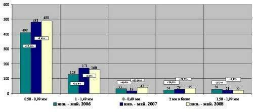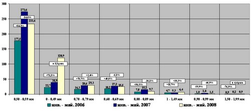 По итогам января – мая 2008 г. потребление холоднокатаного листа возросло во всех диапазонах толщин. Львиная доля потребления х/к листа (рулона) приходится на диапазоны толщин 0,5-0,99 мм и 1-1,50 мм. Прирост потребления обеспечен, в основном, диапазонами толщин 1-1,50 мм и 0-0,49 мм.