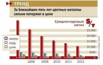 Эпоха сверхприбылей в цветной металлургии заканчивается. Согласнобольшинству прогнозов, в ближайшие годы значительно снизятся цены наникель, медь, алюминий, цинк. Практически все инвестиционныеаналитики — из Альфа-банка, МДМ-банка, UBS и другие, рассчитываяпрогнозные показатели компаний отрасли, закладывают на трех-пятилетнююперспективу более низкие цены на продукцию компаний.
