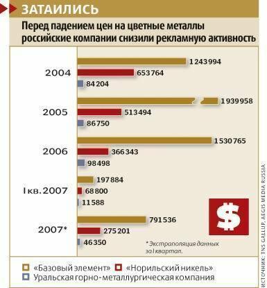 Российские металлурги к предстоящему снижению цен на цветные металлына первый взгляд не подготовились. Если в последние несколько лет ониувеличивали свои расходы на рекламу, то в этом году, судя по цифрам заI квартал, крупнейшие игроки, такие как “Базовый элемент” (холдинг, вкоторый входит “Русский алюминий”), “Норильский никель” и Уральскаягорно-металлургическая компания (УГМК), решили cвои рекламные расходыснизить на 25-50%. В условиях, когда ожидается падение спроса напродукцию, сворачивание промоушна может показаться странным, но ничегоособенно страшного в этом нет — все-таки металлургические комбинатыдействуют не в секторе FMCG, а по прямым договорам с крупнымипотребителями или через трейдеров, так что массовая реклама своеготовара им не требуется.