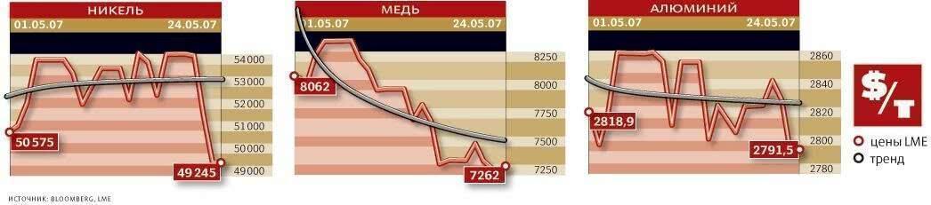 Тем не менее в списке нет ни одного российского медного завода — нииз УГМК, ни из РМК, ни из “Норникеля”. При том что в отличие от другихцветных металлов, снижение цен на которые хотя всеми и ожидается, нопока не слишком заметно, медь с начала мая подешевела на целых 10%.