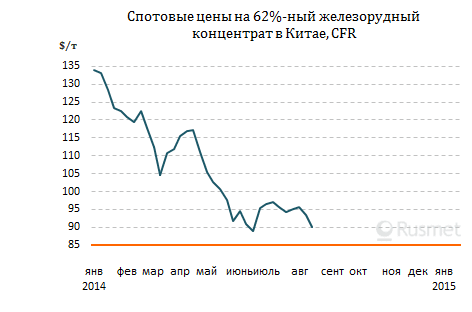 /Rusmet.ru, Виктор Тарнавский/ Стоимость железной руды на спотовом рынке с начала августа медленно идет вниз. Котировки опустились практически до минимального за этот год уровня $89 за т CFR Китай для 62%-ного австралийского материала. Во всяком случае, на Сингапурской бирже цены по сентябрьским контрактам 25 августа уменьшились до $89,5 за т, а сделки по продаже этого материала на свободном рынке в последние дни не превышают $89-90,5 за т.