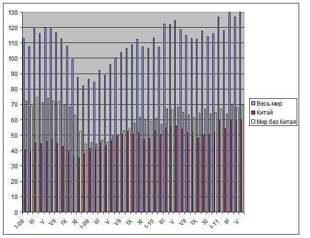 По итогам первых пяти месяцев текущего года мировой объем производства стали достиг 630,9 млн. т, это на 7,1% больше, чем за тот же период прошедшего года. При этом, если ранее темпы роста в Китае и за его пределами не слишком отличались друг от друга, то в последние месяцы Китай начал увеличивать свое преимущество. По данным за пять месяцев выплавка стали в КНР возросла на 8,7% по сравнению с аналогичным периодом 2010 года, а в странах «остального мира» – только на 5,8%. Еще больший контраст возникнет, если взять в качестве базы для сравнения январь-май 2008 года. Тогда получится, что китайские металлурги за последние три года расширили выпуск на 36,2%, а их коллеги в странах «остального мира» – сократили на 6,3%. В большинстве стран мира сталелитейная промышленность так пока и не вернулась на докризисный уровень.