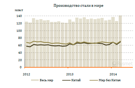 По итогам первого квартала в целом глобальное производство стали достигло 405,7 млн. т, превысив показатели аналогичного периода годичной давности на 4,1%. Как и ранее, основным источником этого роста стал Китай, где выплавка увеличилась примерно на 11 млн. т или на 5,7% по сравнению с первыми тремя месяцами 2013 года. Однако и страны «остального мира» нарастили производство на 2,5%.