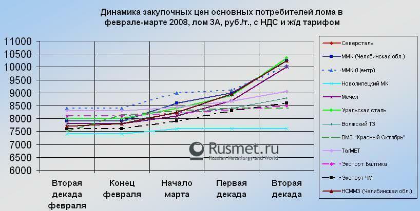 За последнюю неделю интенсивнее всех подняла ценники ОАО «Уральская сталь», что вывело предприятие в ценовые лидеры не только в регионе, но и в целом по стране. Крупнейшие российские потребители лома, ММК и НСММЗ установили похожие ценники как для Челябинской области (порядка 10300 руб/т (с НДС и доставкой)), так и для более удаленных регионов (около 10000 руб/т (с НДС и доставкой))/.