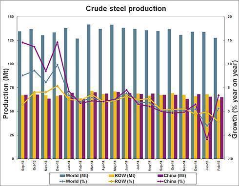 Брюссель, 20 марта 2015 - Мировое производство нерафинированной стали в феврале 2015 года, по данным из 65 стран, представивших информацию Всемирной ассоциации производителей стали (Worldsteel), составило 128 млн. метрических тонн, что на 0,6% больше по сравнению с февралем 2014 года.