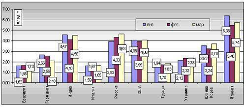 По итогам марта в первую десятку крупнейших производителей стали вошли: КНР (45,101 млн тонн), Япония (5,742 млн тонн), РФ (4,627 млн тонн), Индия (4,5 млн тонн), США (4,063 млн тонн), Южная Корея (3,704 млн тонн), Украина (2,38 млн тонн), Германия (2,1 млн тонн), Турция (1,834 млн тонн) и Бразилия (1,731 млн тонн).