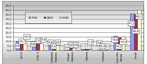 Региональный разрез выплавки стали показывает, что мартовский рост был общемировой тенденцией. Позитивная динамика наблюдалась во всех крупных регионах мира, за исключением Северной Америки – эпицентра мирового финансово-экономического кризиса. ЕС-27 и СНД второй месяц к ряду показывают медленный, но стабильный прирост объемов выплавки стали. Наиболее оптимистическая ситуация складывается в Азии, локомотивом роста которой является Китай, который обеспечил более половины мирового роста производства стали.