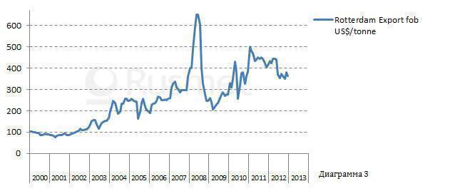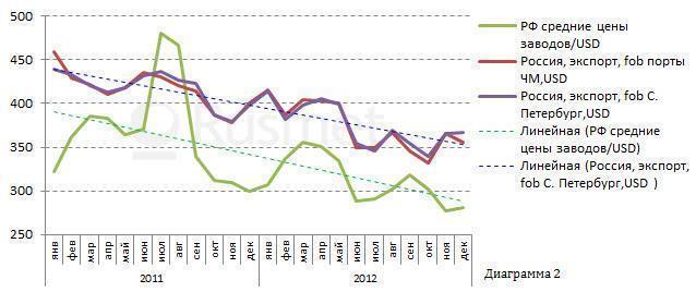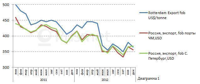 Отставание динамики изменения цен внутреннего рынка составляет примерно месяц, а разница в ценах составляет примерно 50 $.