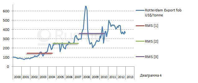 Вступление РФ в ВТО, постепенное нивелирование ограничений на экспорт стального лома приводит к тому, что экспортные цены из РФ все сильнее привязываются к экспортным ценам внешнего рынка (в частности к европейскому).