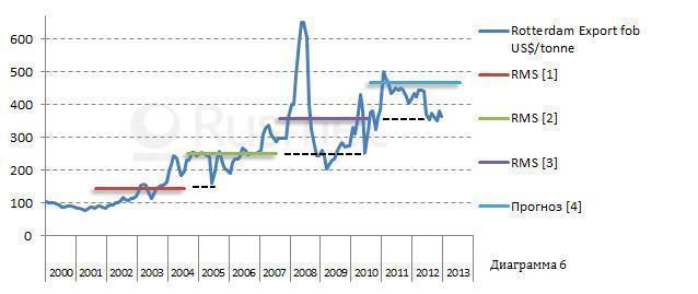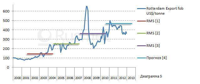 Для начала 2011 года такой прогноз был оправдан. После относительного восстановления от кризиса 2009 года до 2011…2012 года происходил подъем цен к [4]-му (прогнозному) уровню. Но эта тенденция была подорвана второй волной кризиса, особенно в Европе, и цены в конце 2012 года опустились на уровень [3].