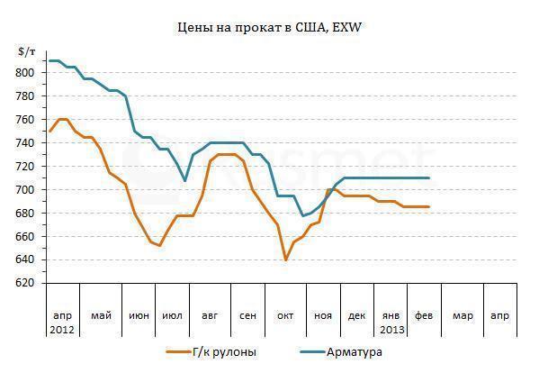 Обнадеживающие сообщения о росте в жилищном строительстве пока не оказали никакого влияния на американский рынок длинномерного проката. Внутренние цены на арматуру остаются на уровне, близком к $710 за т EXW несмотря на все усилия металлургов поднять котировки до $740-750 за т EXW. Помимо слабого спроса, повышению препятствуют предложения турецкой арматуры, поступающие из расчета $610-620 за т CFR. Кроме того, стабильности цен на длинномерный прокат способствует отсутствие прогресса на рынке металлолома. В феврале его стоимость сократилась на $5-10 за т, сведя на нет расчеты металлургов на повышение.